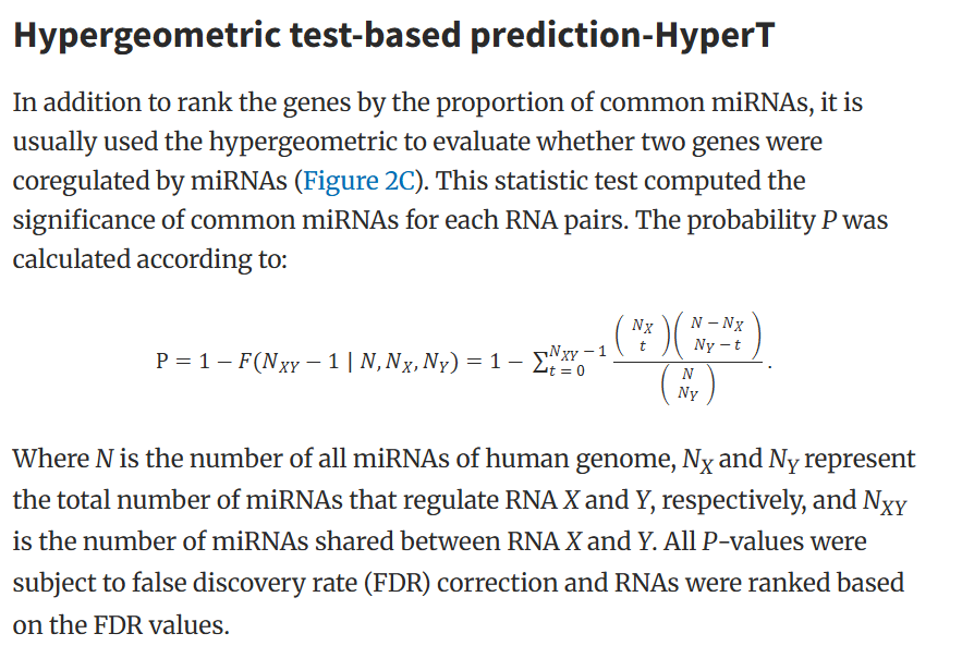 - 根据靶向关系得到 RNAx 和 RNAy 的矩阵,根据共享 miRNA 数量,RNAx, RNAy 的靶向 miRNA 数量和所有 miRNA 的数量计算显著性 P 值和 Q 值 (RNAx,RNAy 分别指一对关系中靶向和被靶向的 RNA)